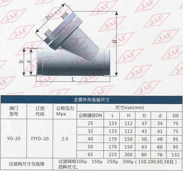 FI表示過濾器 Y表示結(jié)構(gòu)形式為直流式 D表示對焊連接 20代表公稱壓力為2.OMPa 20后不標(biāo)注表示殼體材質(zhì)為鍛鋼。